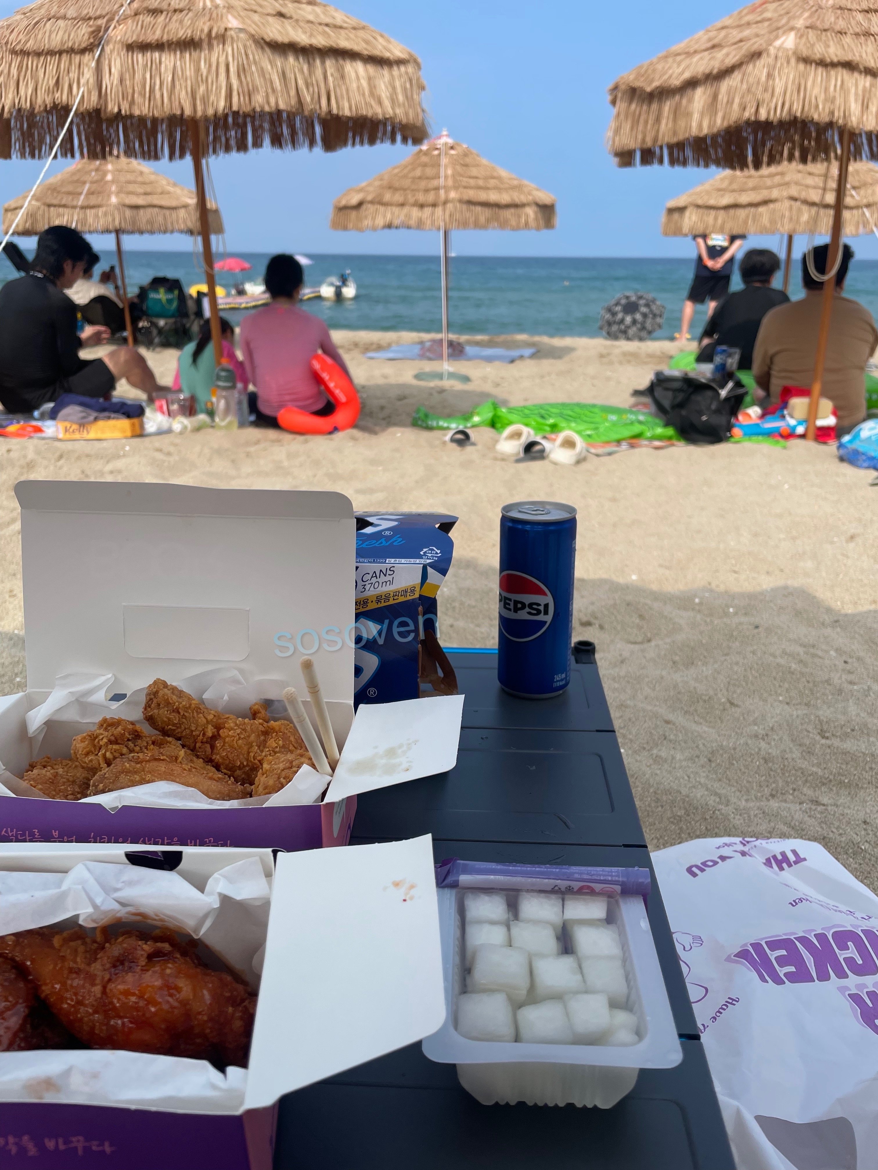 낙산해변입구와 낙산사 근처로 많은 음식점과 즐길것들이 많이 있습니다.  조개구이를 맛보기에 가장 유명한 집은 참새방앗간으로 저녁시간대에 많은 여행객들이 찾은 곳으로 주말이면 대기를 해야할 정도로 인기가 많습니다. 2명이 방문한다면 조개구이 중자를 주문하면 적당합니다. 양은 키조개4개, 새우2마리, 가리비10개, 백합 5개정도가 나오는데 키조개에 피자치즈와 야채등이 섞여있기 때문에 먹다보면 적은 것 같지만 적당합니다. 바닷가 근처 음식점은 크게 기대를 하지 않기에 여행 온 기분을 최우선으로 회와 조개구이에 소주 한잔 하기에 딱 좋습니다. 단점은 조개구이는 손도 많이 가고 너무 덥습니다. 더운거 싫어하는 분들은 다른 메뉴를 찾는게 좋고, 혹시나 가성비를 찾으려고 한다면 힘만드니 차라리 숙소에서 가장 가까운 음식점을 가는 것이 속 편합니다. 낙산해변에서 피크닉으로 치킨을 먹기에는 근처에 있는 부어치킨이 괜찮습니다. 크리스피한 후라이드와 많이 달지않은 양념까지 깔끔하고 맛있게 해변에서 먹을 수 있었습니다. 원래 계획은 물회를 포장해서 해변에서 먹으려 했지만 근처 음식점에서는 단가가 낮은 메뉴라 그런지 포장을 안해주십니다.